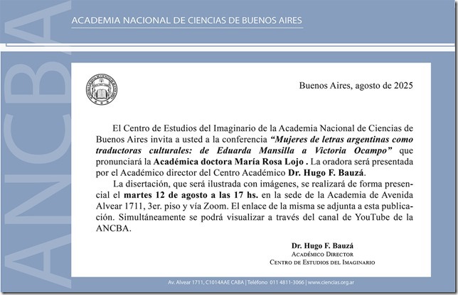 Conferencia de María Rosa Lojo en la Academia Nacional de Ciencias de Buenos Aires, Centro de Estudios del Imaginario: “Mujeres de Letras argentinas como traductoras culturales: de Eduarda Mansilla a Victoria Ocampo”, 12 de agosto de 2025 Publicado por prensa En Sin categoría Presentación de "Cuerpos resplandecientes" en la Feria del Libro de Morón. Diálogo con el Prof. Agustín Algaze, 7 de agosto de 2025 12 agosto, 2025 María Rosa Lojo en "Mundo Migrante", conducción de Carolina Arenes: entrevista sobre los 20 años de "Finisterre", La Once Diez, Radio Ciudad AM 1110,16 de agosto de 2025 12 agosto, 2025